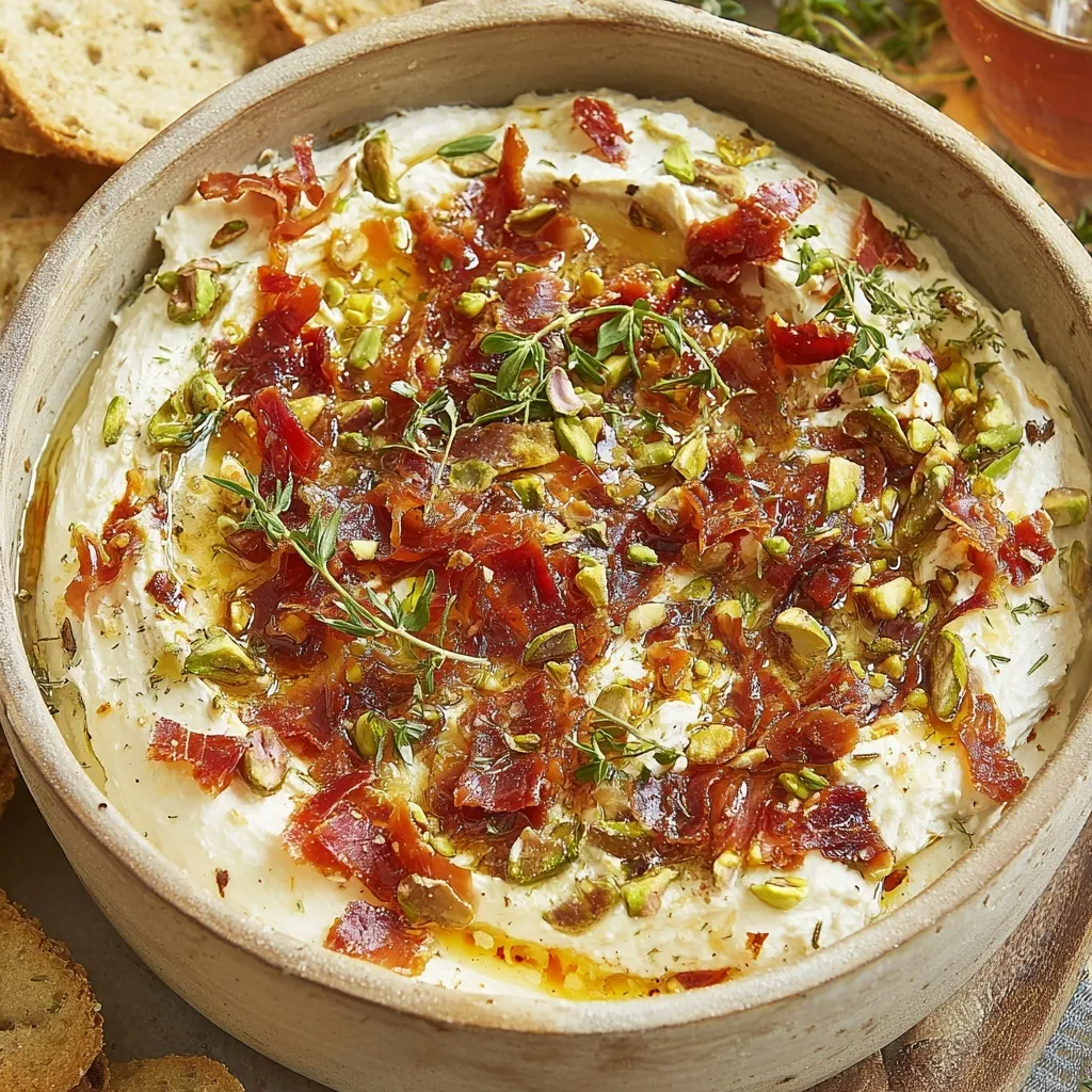 Whipped Brie Cheese Dip with Crispy Prosciutto, Honey & Pistachios